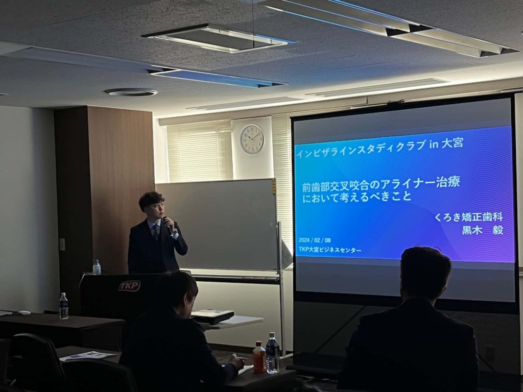 こんにちは。くろき矯正歯科です。ちょっとしたお知らせでございますが、2月8日(木)当院の院長・黒木毅がインビザライン・ジャパン様よりご依頼をいただきインビザラインスタディクラブ in 大宮@TKPビジネスセンターにて講演いたしました。開業以来、この発展著しいインビザラインでの治療を研鑽し、登壇するまでに至ったことは素直にうれしく、また、より一層診療にも力を入れてまいりたいと思った次第です。地域の皆様のお役に立てるよう今後も精進してまいりたいと存じます。よろしくお願いいたします。